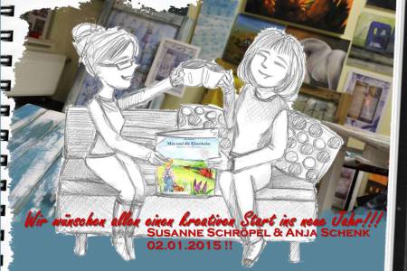 Es ist doch immer wieder toll wenn man sich nach langer, langer Zusammenarbeit endlich auch einmal persönlich treffen kann. So geschehen heute in meiner kleinen Galerie mit Anja Schenk, die viele kleine Bücher von "Max und die Eisenbahn" für mich im Gepäck hatte! Danke für den schönen Nachmittag und da ich leider meinen Fotoapparat vergessen hatte, konnte ich unser gemütliches kreatives Kaffeekränzchen nur per Zeichnung festhalten.